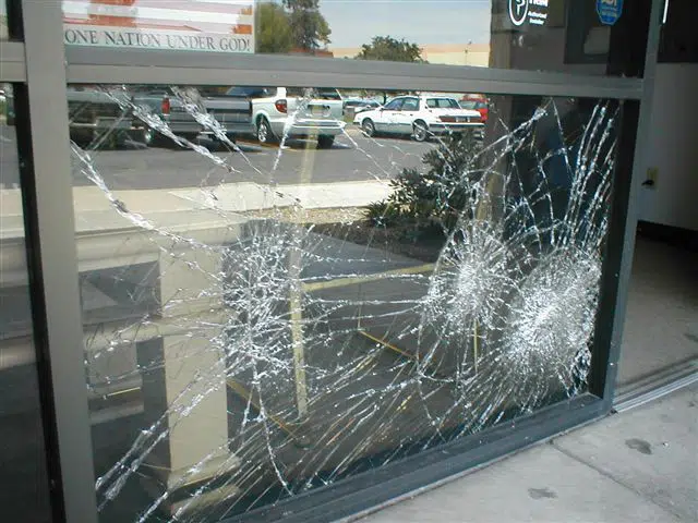 Gelaagd glas wordt heel veel toegepast als inbraakwerend glas. Als u in uw woning gelaagd glas heeft, moet een dief hard werken om bij u binnen te komen door het glas. En dit werken gaat zeker gepaard met het nodige lawaai!. Waarschijnlijk bent u al lang wakker, en zult u een uitgeputte dief aantreffen die buiten achter uw huis zit bij te komen van de vermoeienissen om het gelaagde glas kapot te krijgen. Vaak is het zo dat een alarmsysteem in combinatie met inbraakwerend glas een optimale beveiliging geeft. Natuurlijk is het dan ook van belang dat uw hang- en sluitwerk van de deuren en ramen goed moet zijn. Deze 3 factoren bepalen de inbraakwerendheid van uw woning. Onderstaan een foto die aangeeft dat het moeilijk is door een gelaagde ruit heen te slaan.