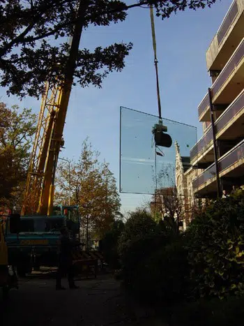 Het lijkt vaak dat alles mechanisch kan, maar het komt maar al te vaak voor dat de plaats waar een (grote) ruit moet worden geplaatst moeilijk bereikbaar is, en dan moeten een aantal mensen gewoon tillen en manoeuvreren om de ruit op zijn plek te krijgen.