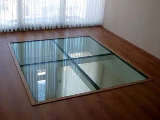De tweede tegel van glas is die waarover wordt gelopen. We zullen dit de glazen tegel noemen. Een tegel van glas in de vloer werkt heel decoratief. Er zijn allerlei mogelijkheden om dit soort tegels te gebruiken, maar over het algemeen is licht en transparantie de belangrijkste drijfveer. Een glazen tegel creëert ruimte, is doorzichtig, waardoor er eventueel iets onder kan worden geplaatst, en is sterk genoeg om erover te lopen.