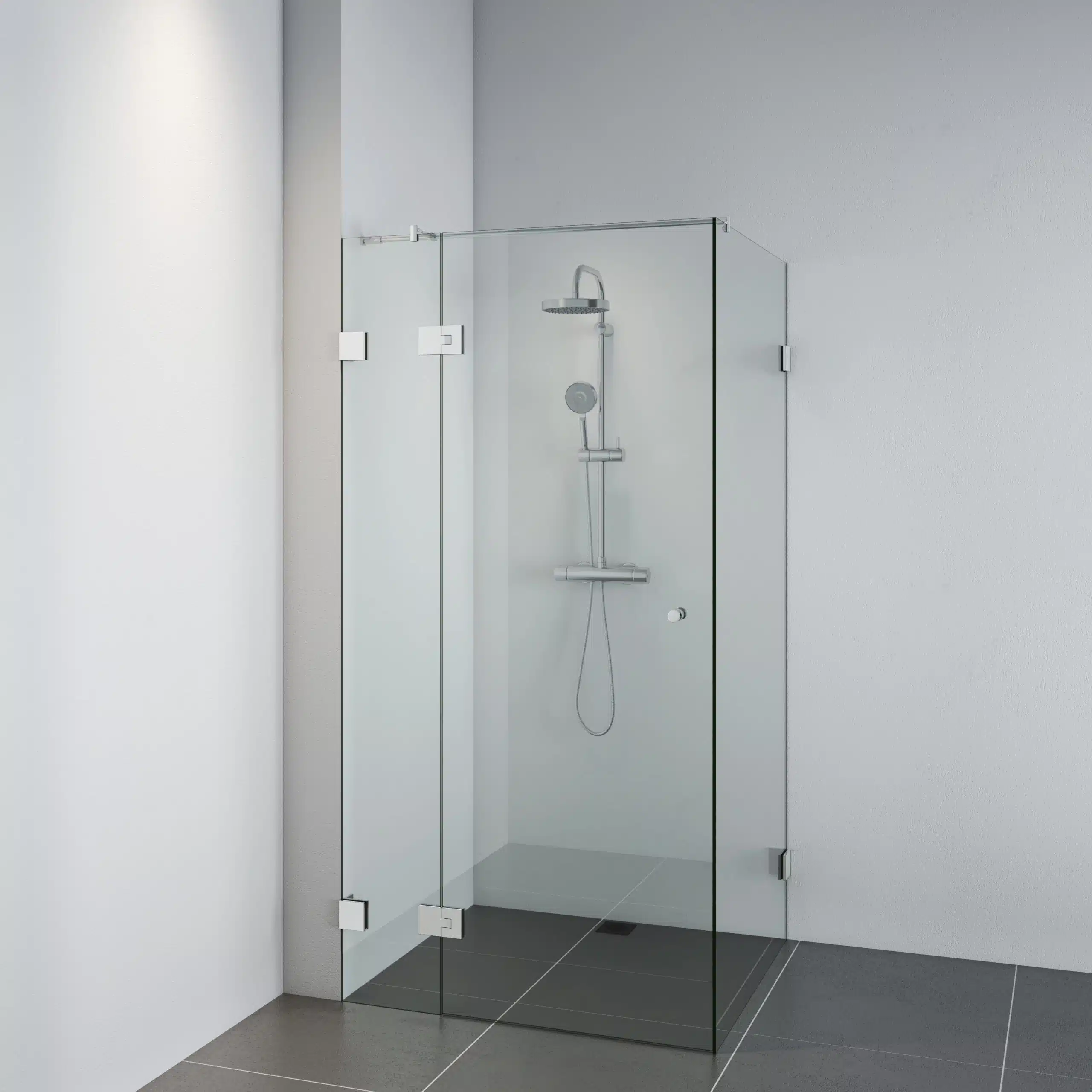 Douchecabine Asti is een mooie keuze wanneer je een open en rustig ogende doucheruimte wilt creëren. Deze opstelling bestaat uit een draaibare douchedeur met daarnaast een vast zijpaneel, waardoor je een strakke en functionele hoekopstelling krijgt. De deur draait soepel aan twee hoogwaardige scharnieren en krijgt de door jou gekozen deurgreep als opener. Het vaste paneel wordt stevig geplaatst met twee subtiele wandklemmen en een slanke stabilisatiestang.