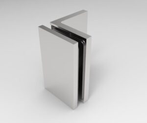 Het zijpaneel naast de deur wordt bevestigd met slanke wandklemmen en sluit via een stevige T-verbinder netjes aan op het grotere hoekpaneel. Dit grotere paneel wordt eveneens met slanke wandklemmen aan de muur geplaatst en krijgt extra stabiliteit dankzij de stabilisatiestang, die zowel met dit paneel als met het zijpaneel en de muur is verbonden.