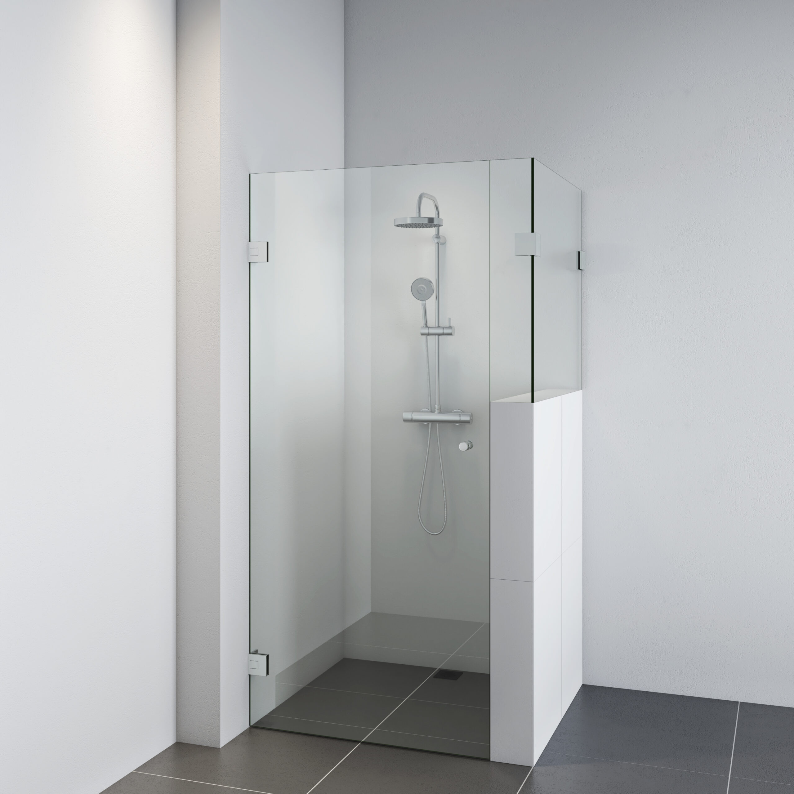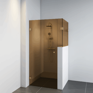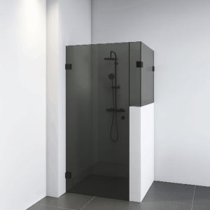 Naast de deur bevindt zich een smal zijpaneel dat strak wordt gemonteerd met een slanke glas-glasklem tegen het andere zijpaneel op het muurtje. Dit paneel wordt ook netjes bevestigd aan de wandklem tegen de muur. Zo ontstaat een strak en rustig ogend geheel dat perfect past binnen een moderne badkamer.