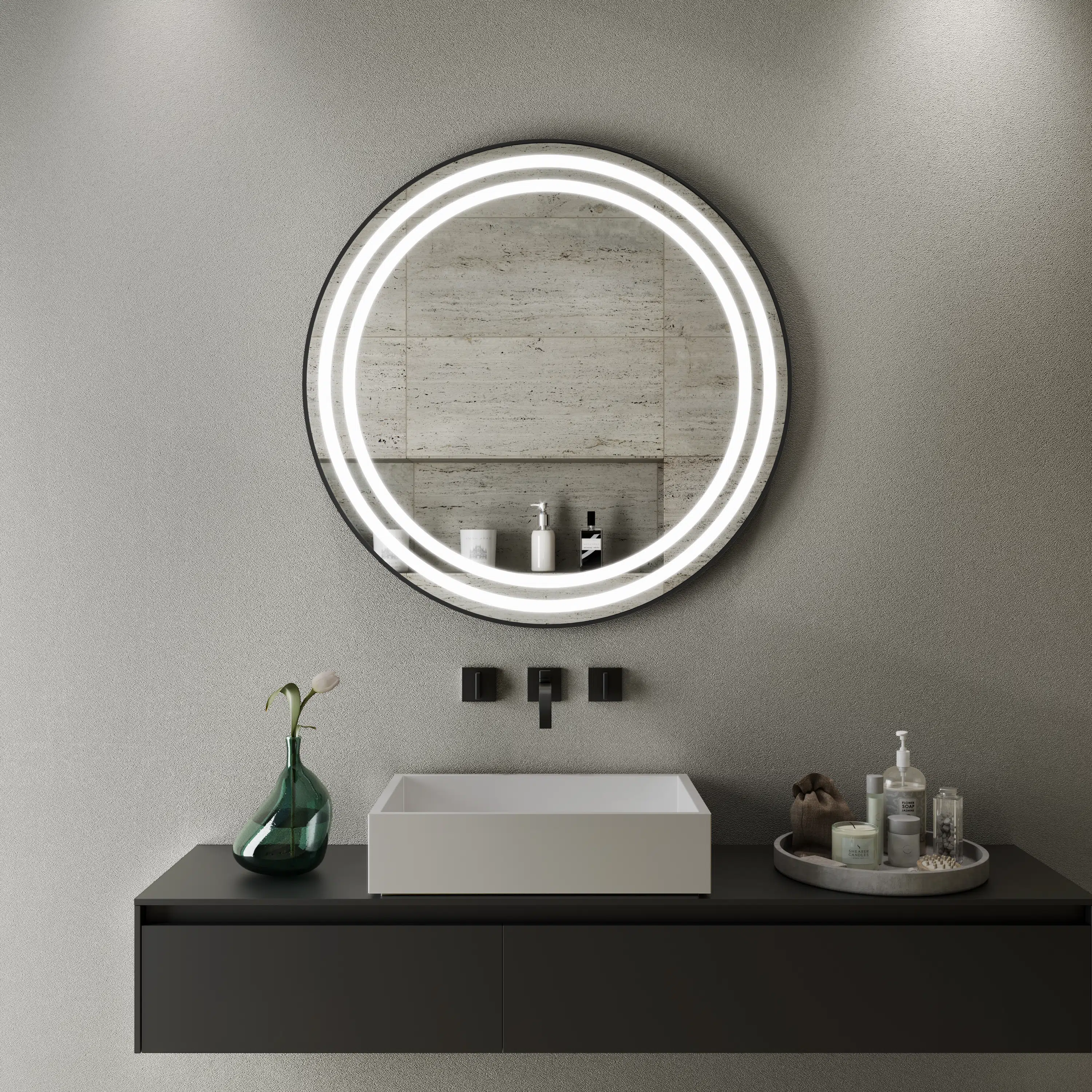 Rond, een zwarte lijst, en stijlvolle LED verlichting