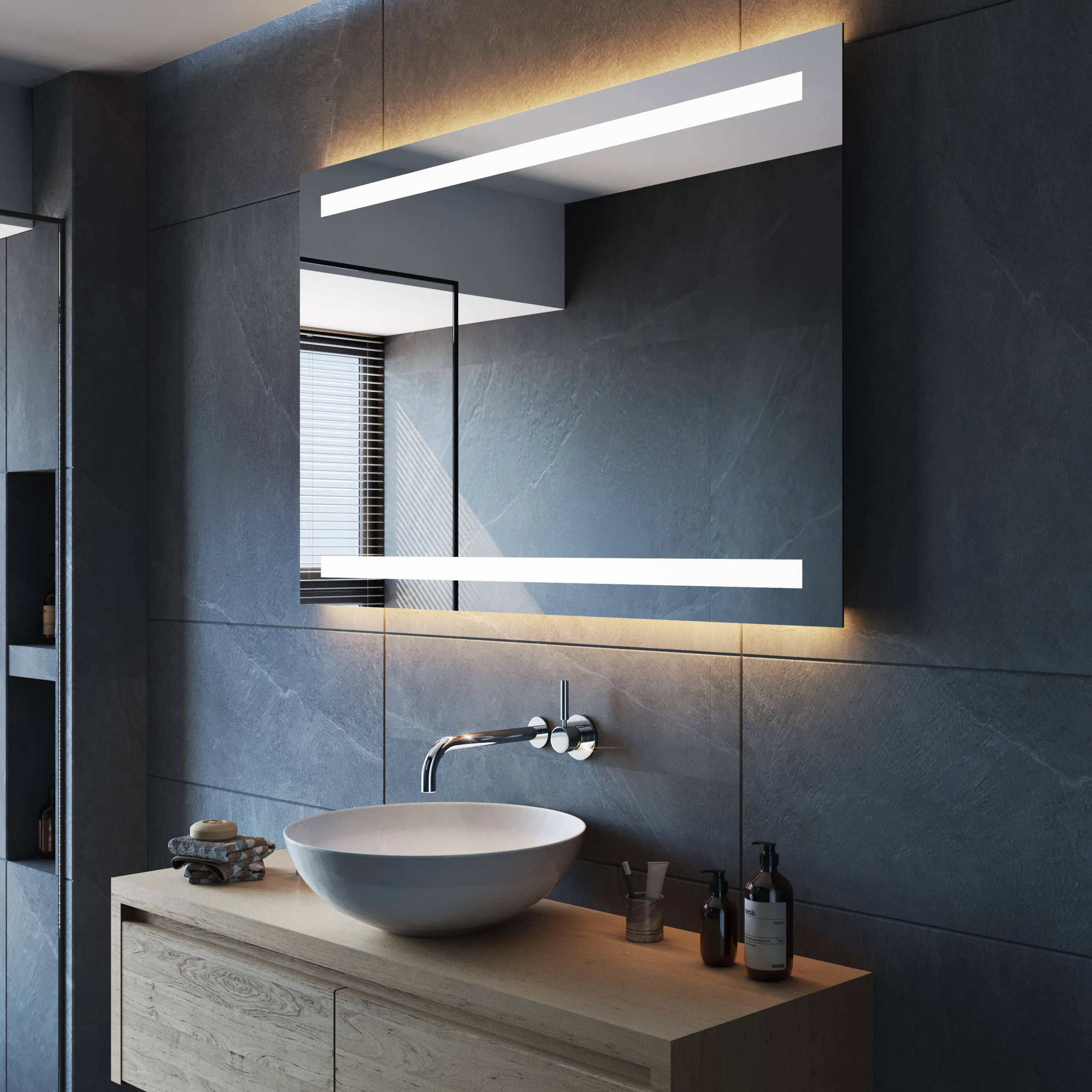 Selecteer uw ideale afmetingen voor de badkamer, kies een lichtkleur die bij u past en rust uw spiegel uit met functies zoals: